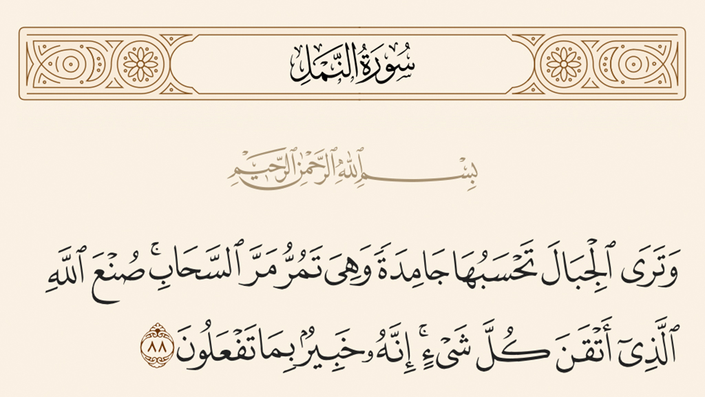 قال تعالى: {وَتَرَى الْجِبَالَ تَحْسَبُهَا جَامِدَةً وَهِيَ تَمُرُّ مَرَّ السَّحَابِ صُنْعَ اللَّهِ الَّذِي أَتْقَنَ كُلَّ شَيْءٍ} [النمل : 88].